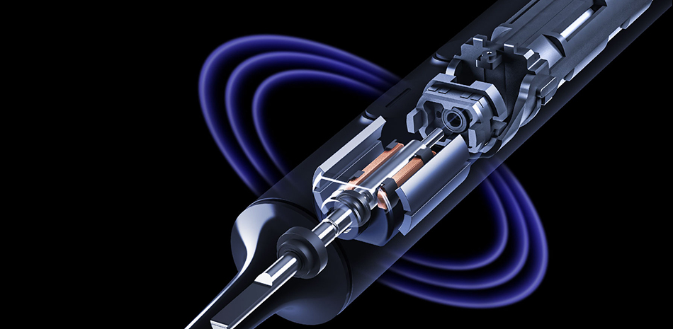 Мощный бесщеточный звуковой двигатель с магнитной подвеской обеспечивает частоту колебаний 39 600 вибраций в минуту для эффективной чистки. Для уменьшения дискомфорта во время чистки используется амортизация.